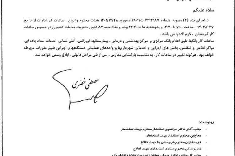 کمیسیون اجتماعی مجلس شورای اسلامی با بررسی ایرادات شورای نگهبان به لایحه کاهش ساعت کاری کارمندان دولت، در نهایت مصوبه کاهش ساعت کاری به ۴۰ ساعت در هفته را تصویب کرد.