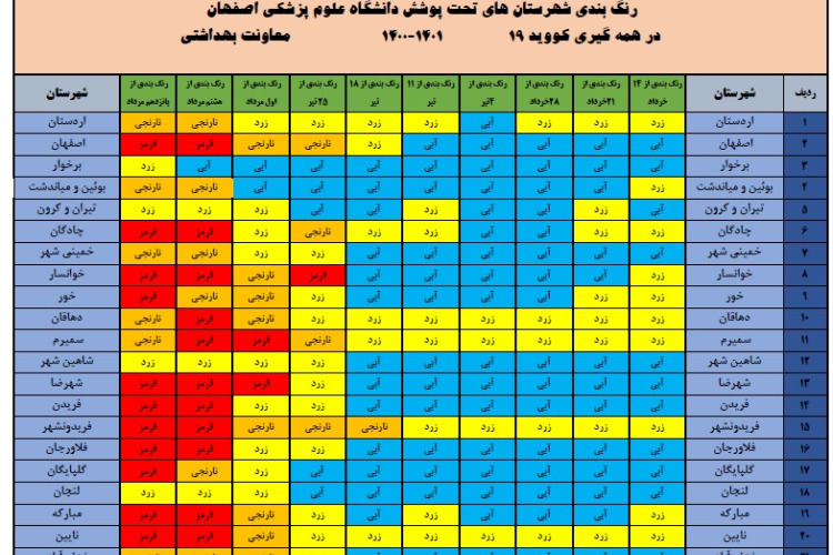براساس اطلاعات وزارت بهداشت، در استان اصفهان (به جز کاشان و آرانوبیدگل) ۱۲ شهرستان در وضعیت قرمز، شش شهرستان در وضعیت نارنجی و چهار شهرستان در وضعیت زرد به سر میبرند.