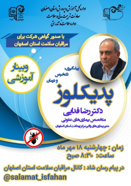 با هماهنگی بعمل آمده توسط گروه سلامت نوجوانان و جوانان و مدارس با اداره کل آموزش و پرورش وبینار آموزشي پدیکلوز با صدور گواهی آموزشي در پیام رسان شاد جهت کلیه مراقبین سلامت مدارس  آموزش و پرورش استان اصفهان در روز چهارشنبه ۱۸ مهرماه با تدریس دکتر فدایی مدیر گروه واگیر مبارزه با بیماری ها برگزار میگردد.