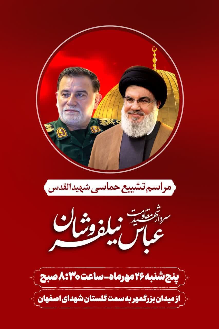 مراسم تشییع حماسی شهید القدس سرلشگر شهید حاج عباس نیلفروشان پنج شنبه ۲۶ مهرماه ۱۴۰۳ از ساعت ۸:۳۰ صبح از میدان بزرگمهر به سمت گلستان شهدای اصفهان