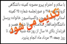 با عنایت به دستور مقام عالی وزارت بهداشت، درمان و آموزش پزشکی به معاون بهداشتی وزارتخانه مبنی بر واکسیناسیون کووید بستگان درجه یک پرسنل درگیر در برنامه‌های کووید ۱۹ و همچنین عطف به مصوبه کمیته دانشگاهی واکسیناسیون، مقرر گردید لیست بستگان درجه یک پرسنل بیمارستان های منتخب کووید، مراکز منتخب سرپایی کووید، پرسنل درگیر در تشخیص آزمایشگاهی کووید و ناظرین این واحدها توسط معاونت های بهداشت و درمان به جهت هماهنگی اجرای واکسیناسیون ارائه گردد که برنامه زمانبندی واکسیناسیون این گروه متعاقباً اعلام خواهد شد.
