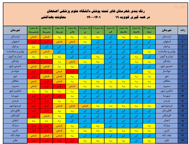 در استان اصفهان (به جز کاشان و آرانوبیدگل) ۱۲ شهرستان در وضعیت قرمز، شش شهرستان در وضعیت نارنجی و چهار شهرستان در وضعیت زرد به سر میبرند.
