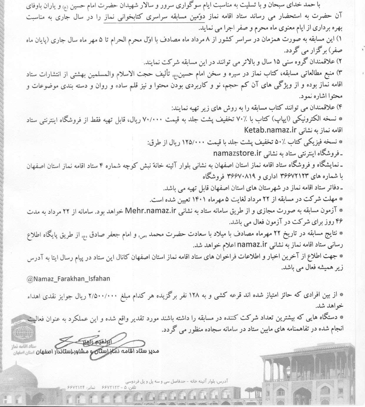 ستاد اقامه نماز برگزار می کند: این مسابقه به صورت همزمان در سراسر کشور از 8 مرداد ماه الی 5 مهرماه برگزار میشود. اطلاعات بیشتر کلیک فرمایید